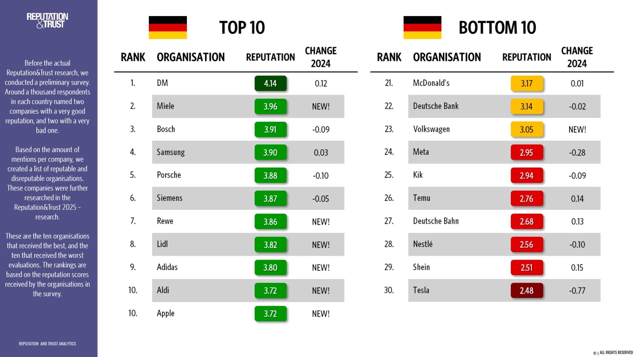 Comme le rapportent les spécialistes d’Electrek, l’image du constructeur s’est clairement dégradée dans certains de ses marchés les plus importants d’Europe. D’après l’étude « Reputation & Trust 2025 » menée par les Finlandais de Reputation and Trust Analytics, Tesla figure désormais parmi les marques les moins appréciées par les gens en Finlande, en Suède, en Norvège et au Danemark, pays tous étudiés par cette société qui interroge le public sur huit thématiques spécifiques pour chaque marque (produits et services, innovation, perception des dirigeants, performance financière, communication de l’entreprise, ambiance de travail et responsabilités). En Allemagne, Tesla est même désigné comme l’entreprise à l’image la moins bonne, encore plus mal notée que Shein qui a récemment défrayé la chronique en France !