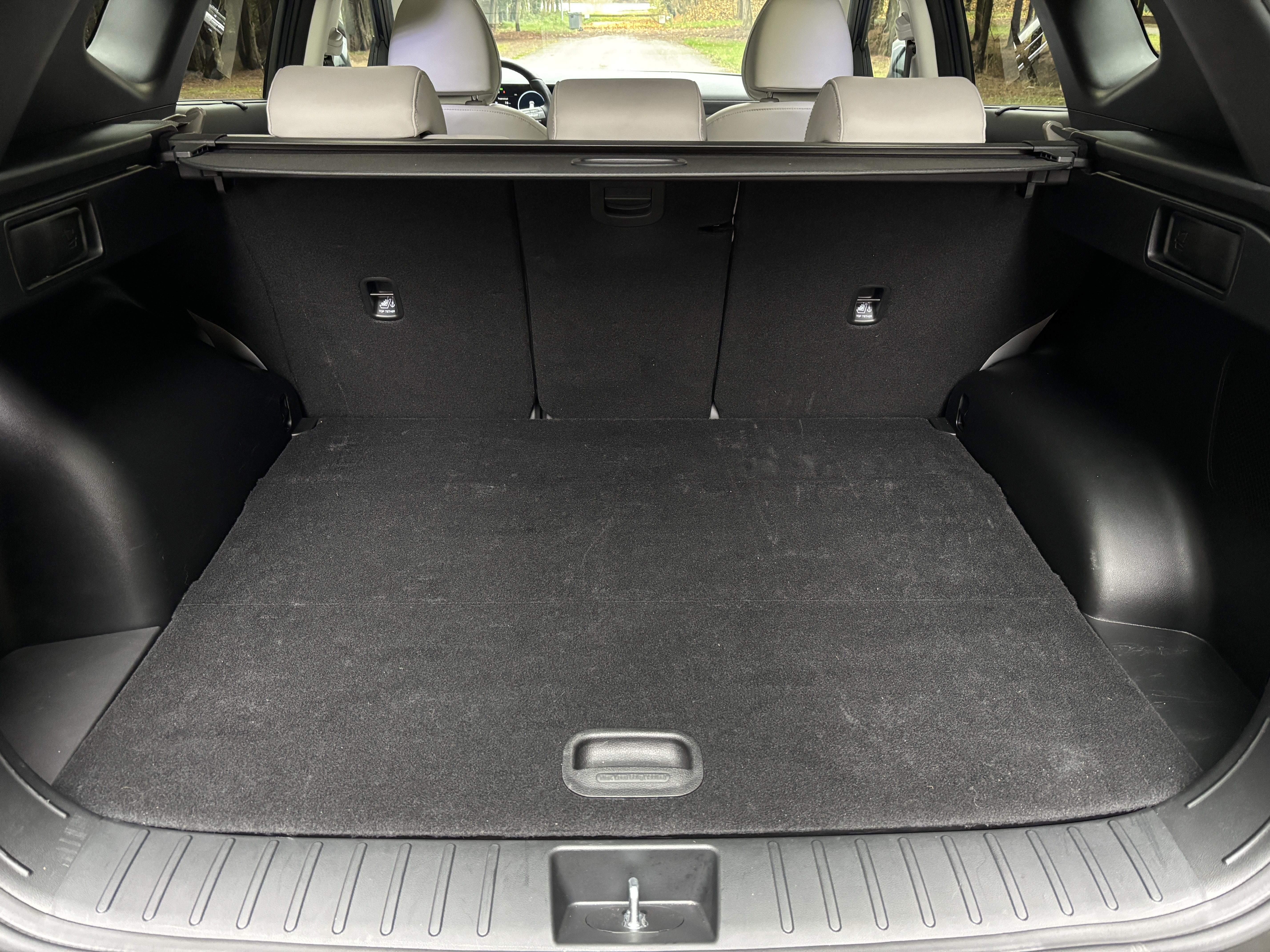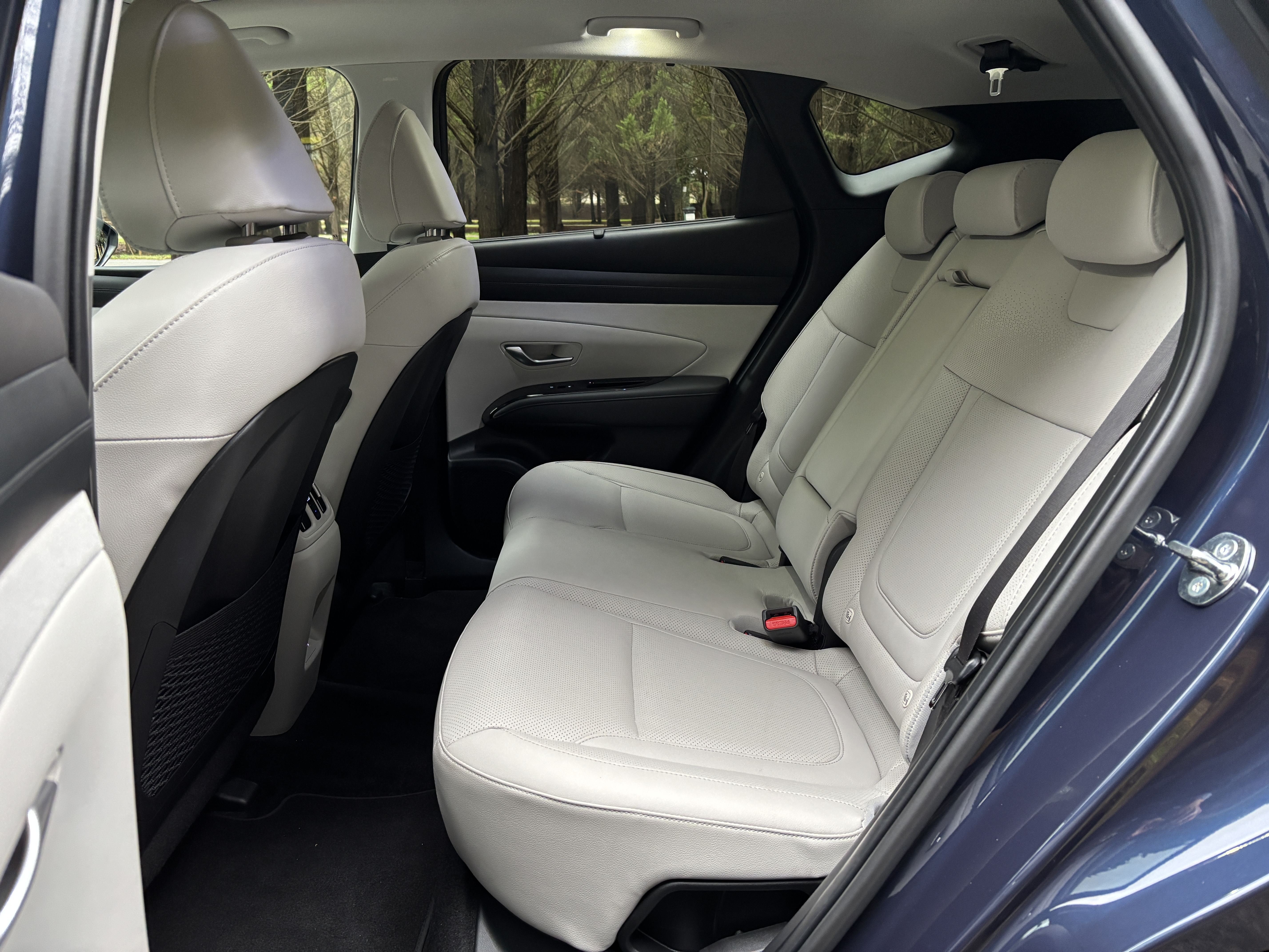 Les matériaux sont plutôt bien choisis, et qualitatifs dans l’ensemble. On se serait tout de même bien passés de certains inserts noirs laqués à la mode au milieu des années 2010. À vivre, le Tucson coche toutes les bonnes cases. Il soigne particulièrement les passagers arrière par un espace généreux aux genoux. Deux adultes de bonne taille auront leur aise. Un confort renforcé par un dossier inclinable, des points de charge USB et une assise bien creusée. On aime toujours autant l’astucieux système de réglages électriques des sièges avant (le long du dossier) accessible depuis les places arrière, permettant de moduler l’espace en fonction de l’usage. Quant au coffre, il est toujours dans le coup avec 552 litres (VDA). En revanche, il faudra se passer de double fond. Hyundai a tenté de laisser un petit rangement mais il est minuscule.