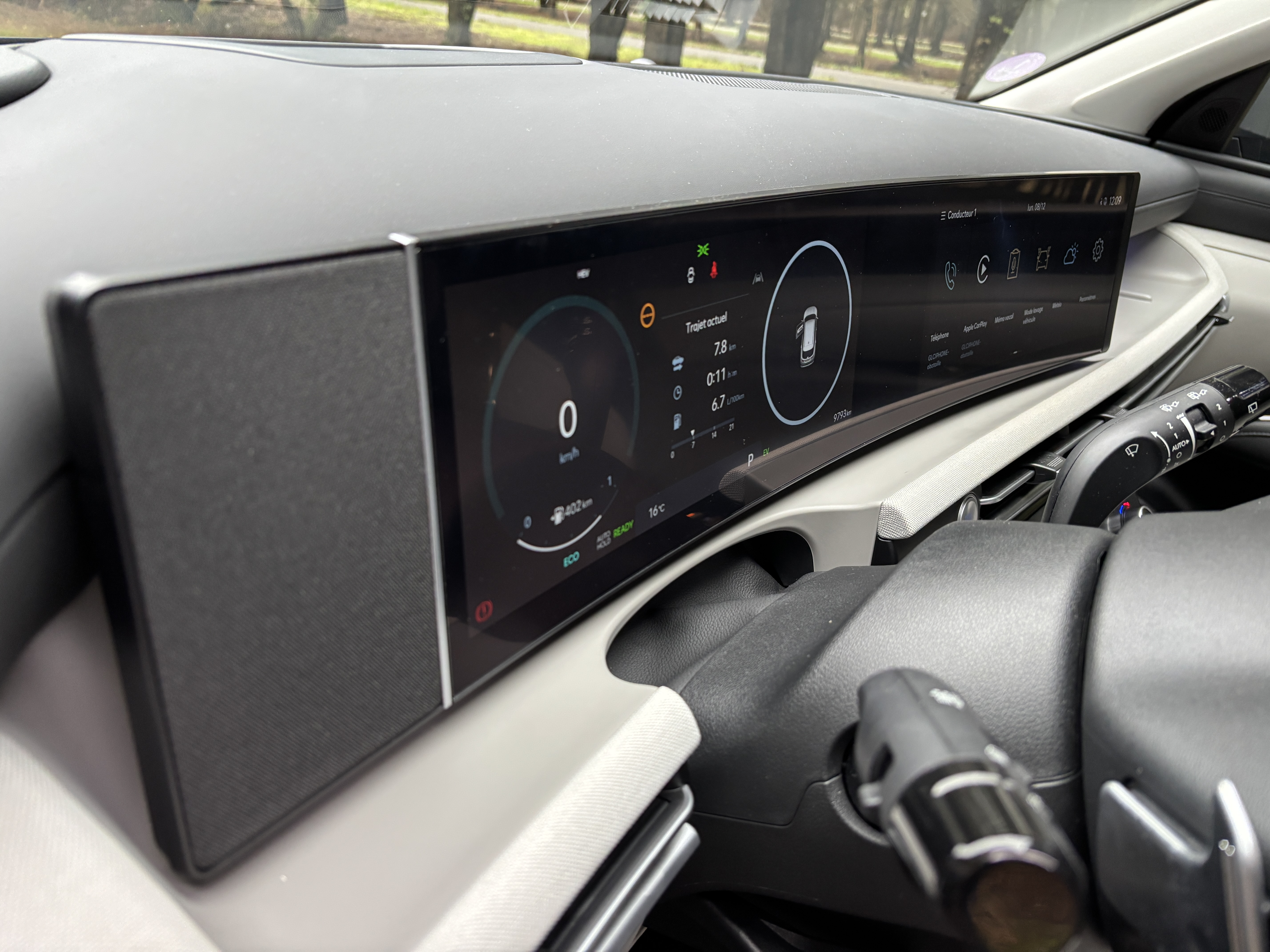 Les modifications sont en revanche beaucoup plus profondes à l’intérieur puisque Hyundai a décidé de changer totalement la planche de bord, un fait rarissime dans un restylage de mi-carrière. L’engin dispose désormais d’une grande dalle incurvée avec un combiné d’instrumentation de 12,3 pouces et un écran tactile central de 12,3 pouces aussi.