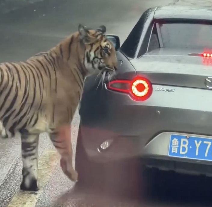 Le clip partagé sur le réseau social Instagram dévoile un embouteillage animé par une scène particulièrement insolite. La vidéo montre en effet un tigre bien déterminé à en découdre avec la poupe d’une Mazda MX-5 RF. Par chance pour son propriétaire, cette version à toit en dur rend la tâche particulièrement difficile pour le félin avantagé par la circulation lente de la route embouteillée.