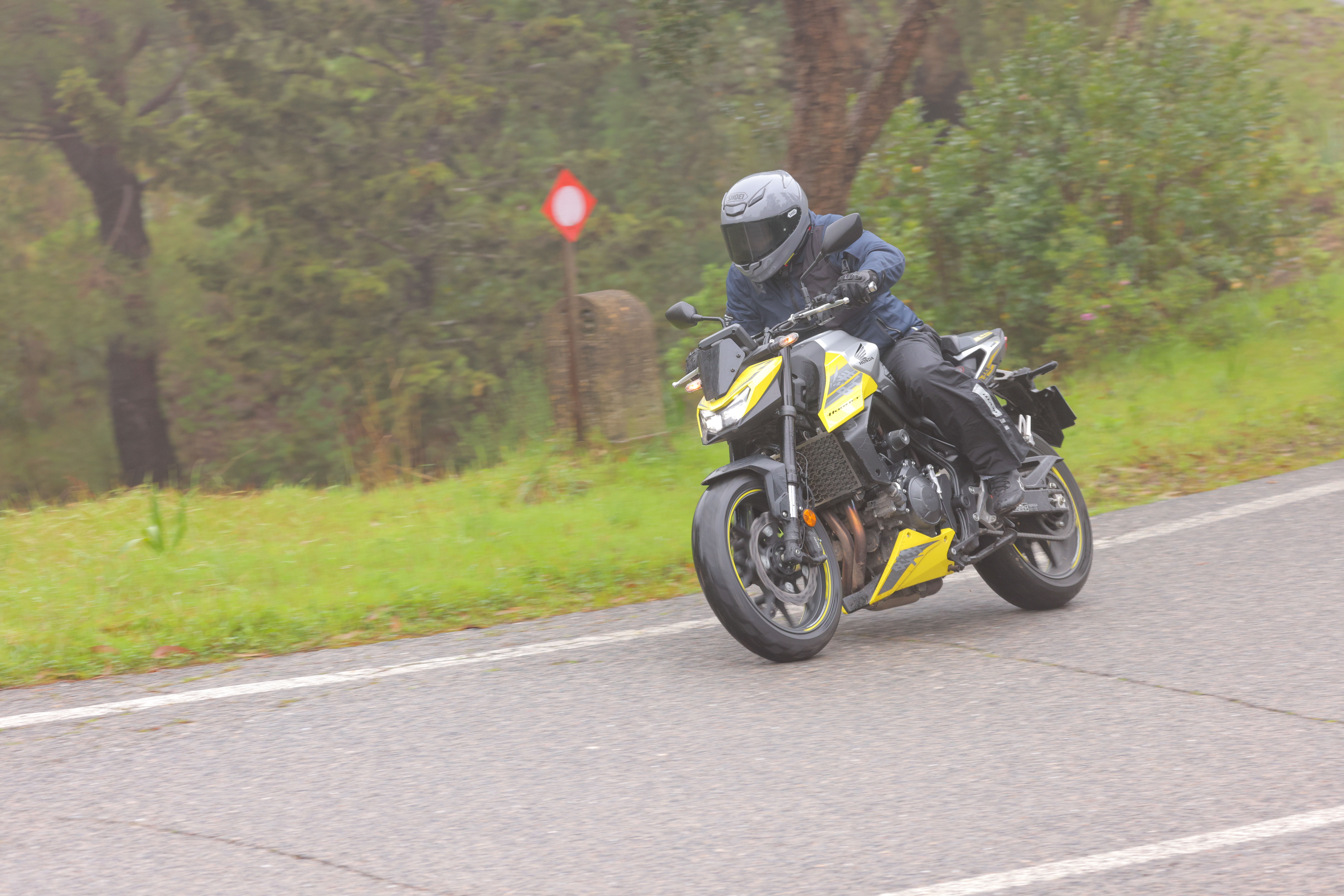 Nul besoin de vous acclimater à la moto pendant une longue période pour prendre la confiance à son bord. En effet, le frelon est un réel ambassadeur de la philosophie de la marque japonaise : faire des motos efficaces et faciles à prendre en main. Nous avons pu nous rendre dès les premiers virages de la campagne portugaise que la Hornet était une moto saine avec des réglages d’origine qui aurait été presque parfaite pour s’attaquer à un rallye routier. L’ensemble de suspensions est par exemple très bien calibré pour faire face aux diverses imperfections aléatoires des petites départementales de l'Algarve et pour encaisser des gros freinages. On a aimé sentir l’amortisseur se tasser, celui-ci nous donnant en quelque sorte le feu vert pour remettre la poignée dans l’angle en milieu de courbe. De l’autre côté la fourche plus ferme permet des entrées en courbes assez vives sans que la moto ne sourcille. C’est agréable et ça vous met en confiance. Cette bonne connexion au bitume est sublimée par une nouvelle monte pneumatique d’origine : des Michelin Road 6 dont nous avons pu mettre la polyvalence à rude épreuve, car cet essai s’est donc déroulé sous la pluie et des routes séchantes. Et peu importe les conditions, les pneus ont fait preuve d’une tenue de route exemplaire.
