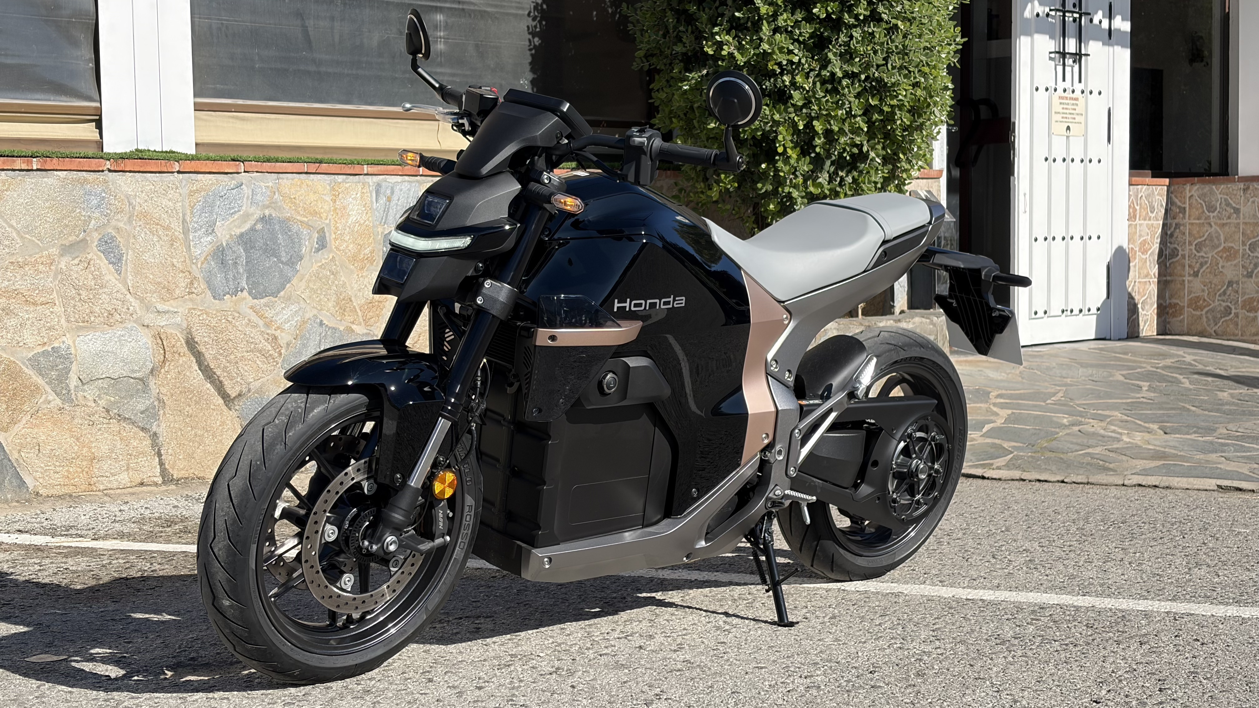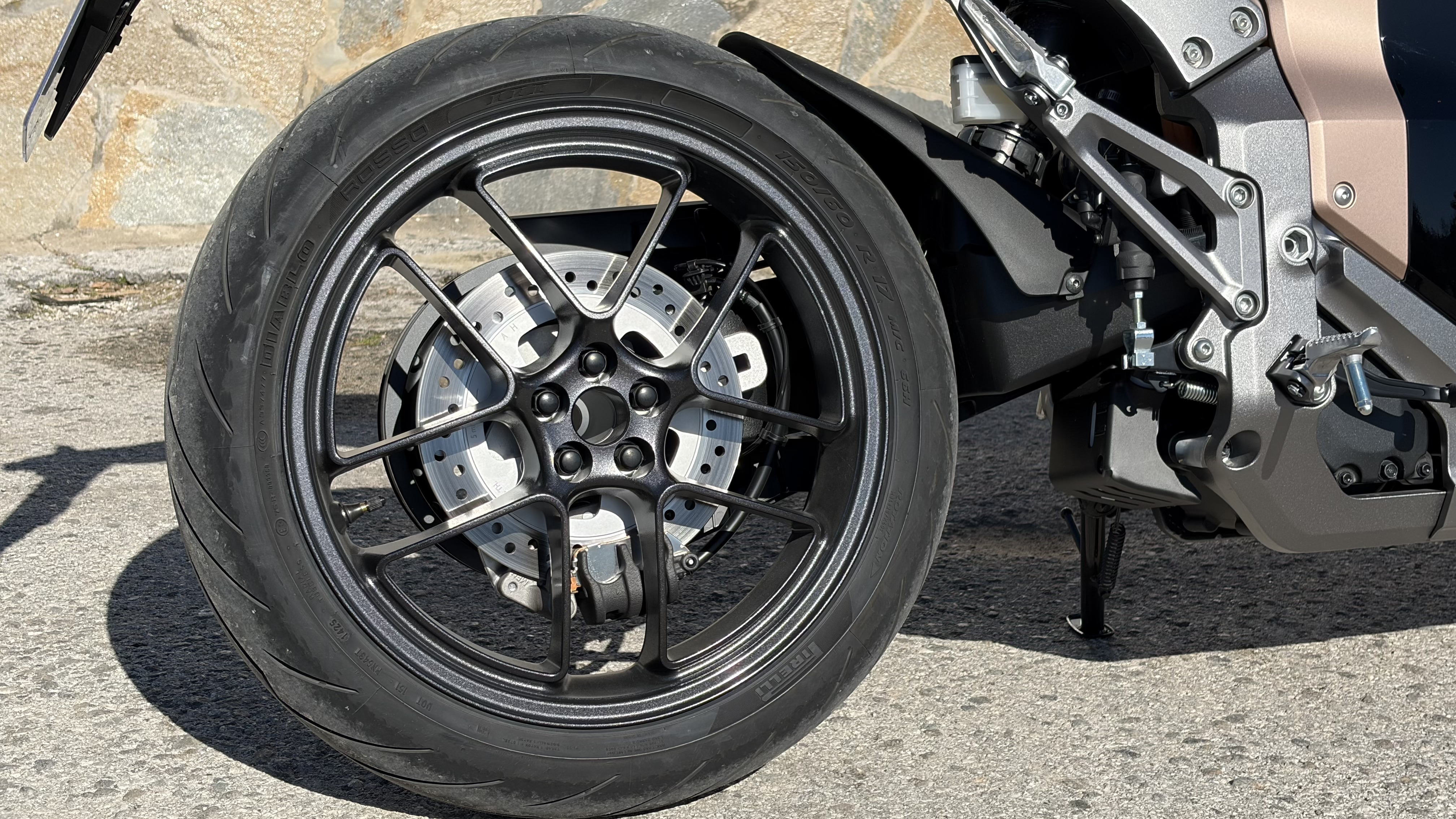 Pour le freinage, Honda fait une fois encore appel à Nissin avec un système basé sur deux disques avant de 296 mm pincés par des étriers quatre pistons, et un disque arrière de 256 mm associé à un étrier simple piston. L’ensemble est piloté par une centrale inertielle intégrant un ABS actif sur l’angle, et associé à une autre nouveauté majeure chez Honda : le freinage régénératif qui offre une expérience de pilotage vraiment intéressante comme on le verra plus loin. Les jantes de 17 pouces sont chaussées de pneumatiques en 120/70-17 à l’avant et 150/50-17 à l’arrière.