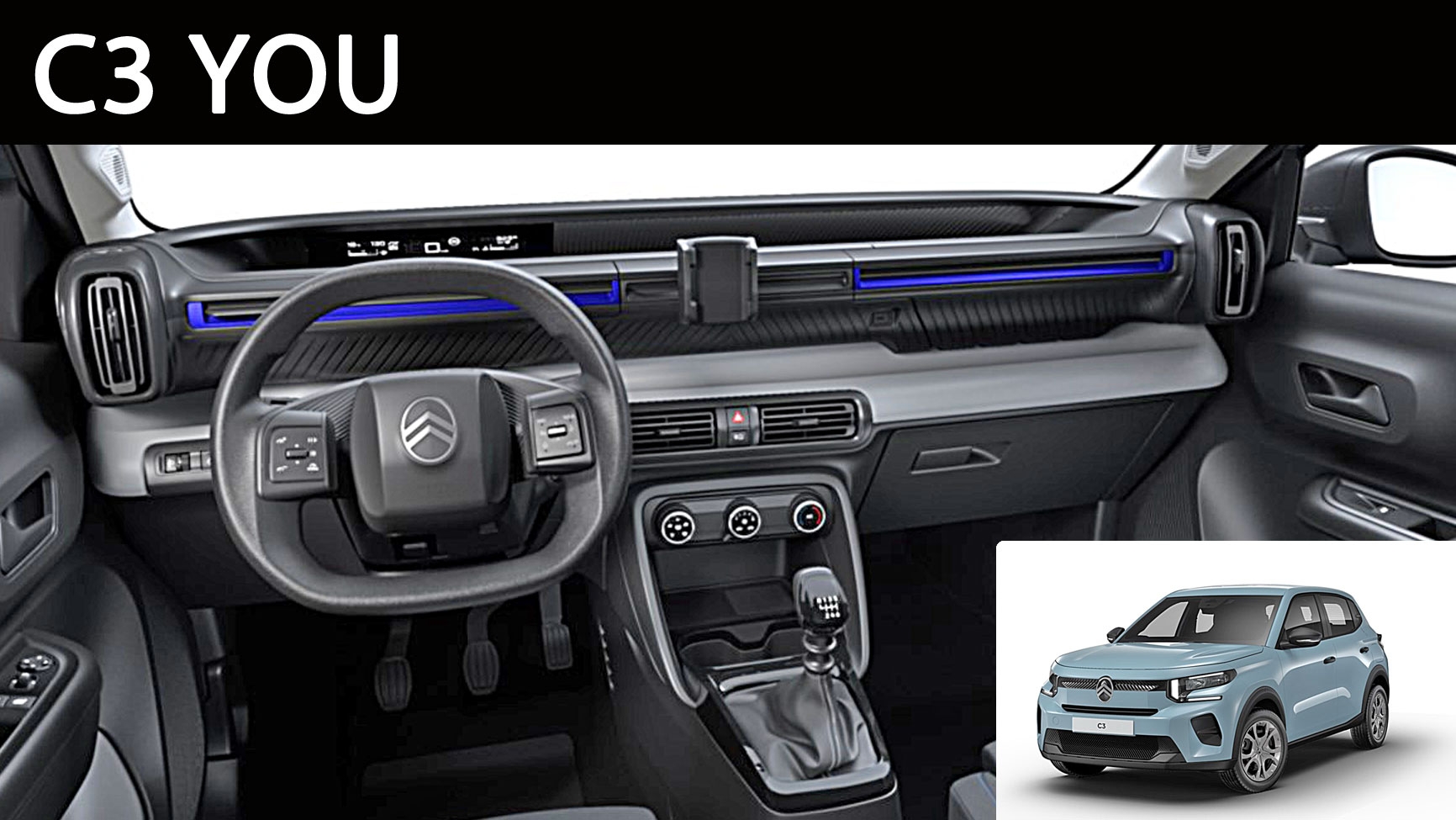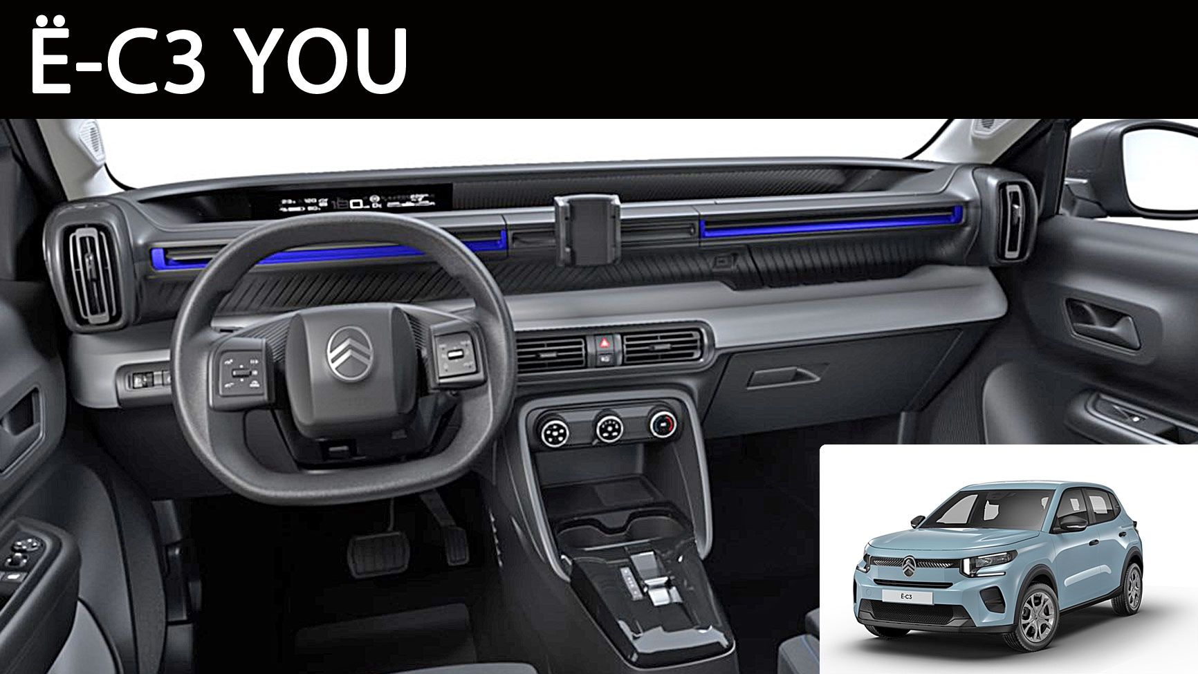 Sans être une finition bas de gamme, la finition You des Citroën C3 et Citroën Ë-C3 manque un peu de fun en ce qui concerne la dotation en équipements et ne dispose pas de barres de toit, de roues de 17 pouces (elle est limitée à des jantes de 16 pouces), pas d’inserts colorés (Color Clips) sur le bouclier avant et les custodes arrière, c’est le plastique noir qui règne en maître. Dans l’habitacle, pas de sièges Advanced Comfort (ils sont plus moelleux et équipent les autres finitions) ni de banquette fractionnable, elle est rabattable, mais d’un seul tenant et l’écran multimédia cède la place à une station d’accueil pour un smartphone. Malgré tout, elle ne fait pas l’impasse sur les équipements de sécurité ni sur certaines aides à la conduite.