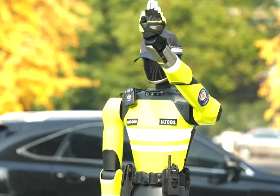 Il lève le bras pour faire stopper les véhicules, indique quand avancer, interpelle les usagers distraits et utilise même un sifflet numérique pour imposer son autorité. Tous ses gestes sont calqués sur ceux de véritables agents de la circulation, appris à partir de modèles humains réels. La scène est déroutante : futuriste, mais parfaitement fonctionnelle.