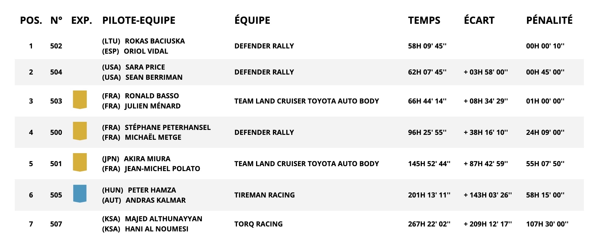 Et c’est finalement le Defender D7X-R numéro 502 de Rokas Baciuska et Oriol Vidal qui s’est imposé, devant celui de Sara Price et Sean Berriman. Stéphane Peterhansel, lui, a terminé quatrième de la catégorie avec son navigateur Michaël Metge derrière le meilleur des Toyota Land Cruiser.