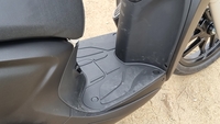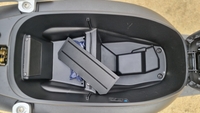 On retrouve ainsi un vide-poches côté gauche, suffisant pour une carte de crédit, un chiffon et quelques menus effets. Inséré dans le tablier avant, il profite de l’absence de radiateur dévolu au refroidissement du moteur. Comme quoi le refroidissement par air peut avoir des avantages. Ce petit compartiment ne ferme certes pas à clef, propose un loquet d’ouverture basique, mais dépanne sur un scooter où la place se fait normalement chère et rare.