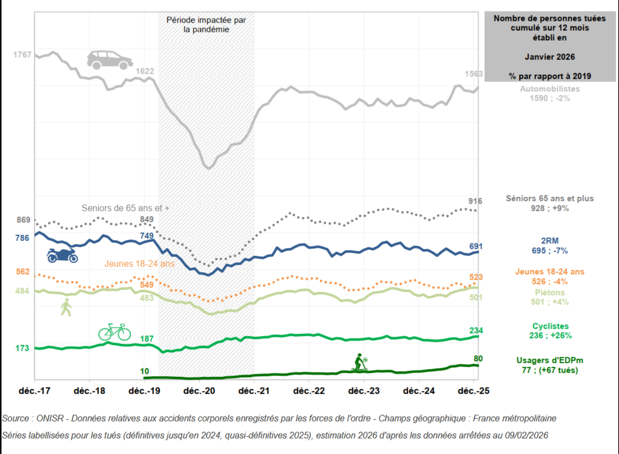 La situation des deux-roues motorisés reste fragile avec 4 décès supplémentaires en janvier, bien que leur mortalité annuelle recule légèrement (-1 % avec 695 décès). En revanche, le bilan est sombre pour les mobilités dites « douces ».