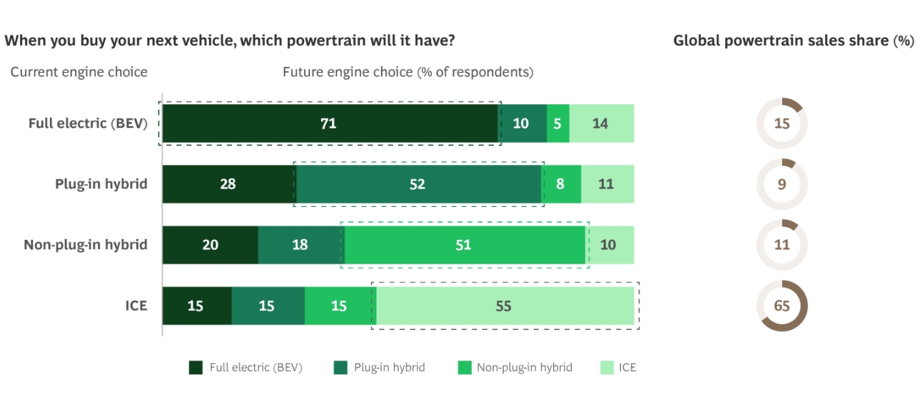 Il faut croire que l’inertie des acheteurs et la force des habitudes sont fortes. Car dernier chiffre : les possesseurs de voitures thermiques (ICE) seraient 55 % à choisir à nouveau une thermique pour le renouvellement de leur auto, et seulement 15 % à choisir une électrique (15 % d’hybrides et 15 % d’hybride rechargeable). Par contre 71 % des possesseurs de VE choisiraient à nouveau un VE, et seulement 14 % (ou, tout de même 14 %, selon le point de vue), repasseraient au thermique.