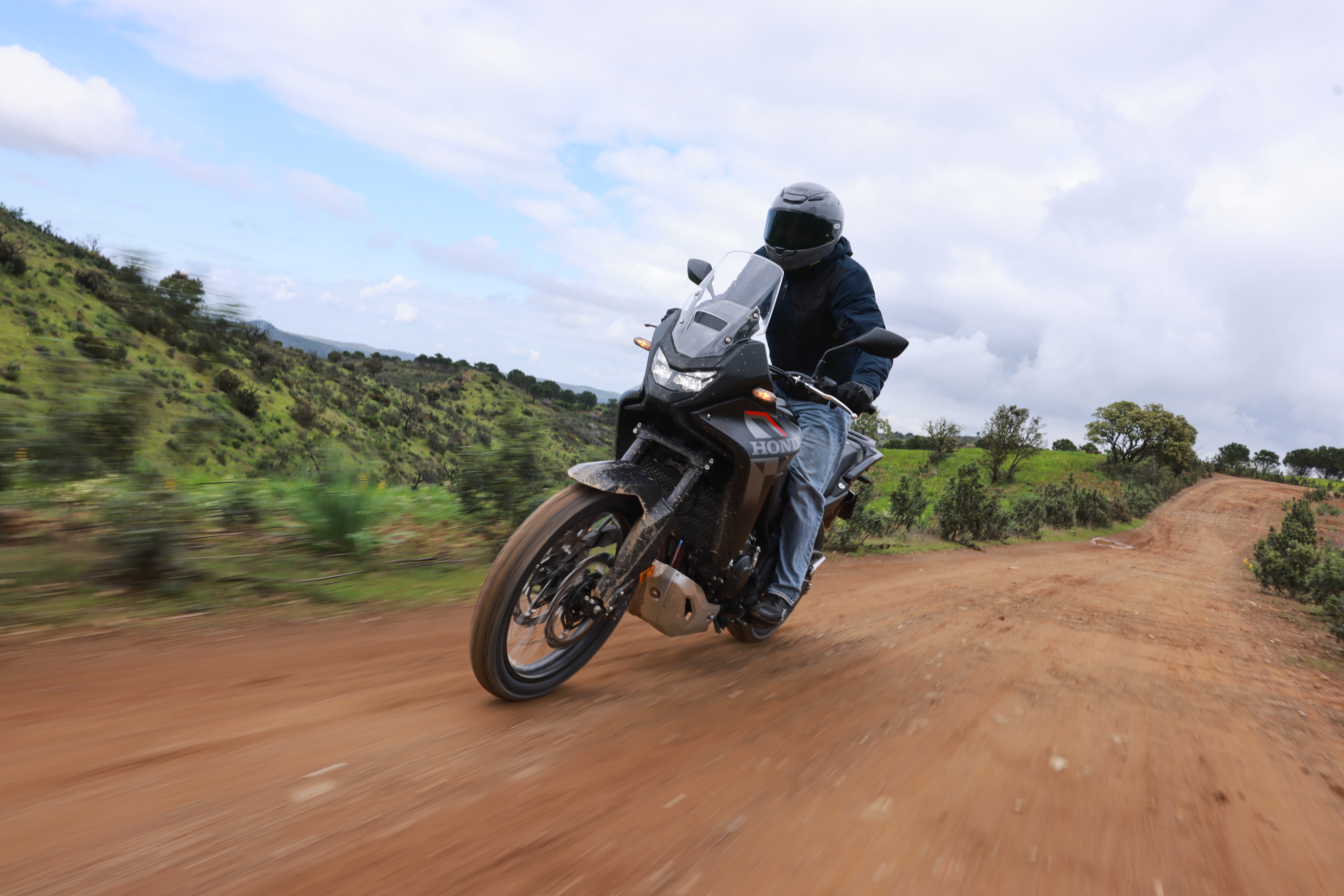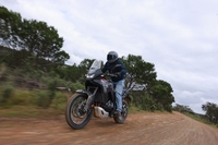 Passons maintenant au moteur qui sans surprise s’avère être très satisfaisant à utiliser dans la terre. Le gras du bicylindre de la Transalp se marie à merveille avec le gras de la terre sur laquelle nous avons roulé. La moindre rotation de la poignée entraîne un patinage de la roue arrière assez jouissif. Et puis si vous êtes un peu moins téméraire le HSTC régulera parfaitement l’accélération du trail Honda sans pour autant ruiner le plaisir procuré par le couple de ce moteur. Et puis si cela ne suffit pas à vous mettre en confiance, c’est là que le E-Clutch entre en scène. Le fait de ne plus avoir à se soucier de son levier d’embrayage en off-road est un atout et un confort indéniable. Que cela soit pour les débutants comme pour les amateurs. La dizaine de kilomètres que nous avons parcourue dans la broussaille portugaise nous a offert quelques petites embûches comme une petite montée en virage sur un sol rocailleux. C’est au moment de tourner dans cette petite grimpette qu’on s’est rendu compte comment cet embrayage intelligent pouvait être d’une aide précieuse. En arrivant un peu trop lentement au moment de pivoter la machine, on a pu voir que le tableau de bord nous demandait de rétrograder si possible mais finalement la magie du e-clutch a opéré et la moto s’est mise toute seule au bon régime afin de nous donner suffisamment de traction afin de passer la côte.