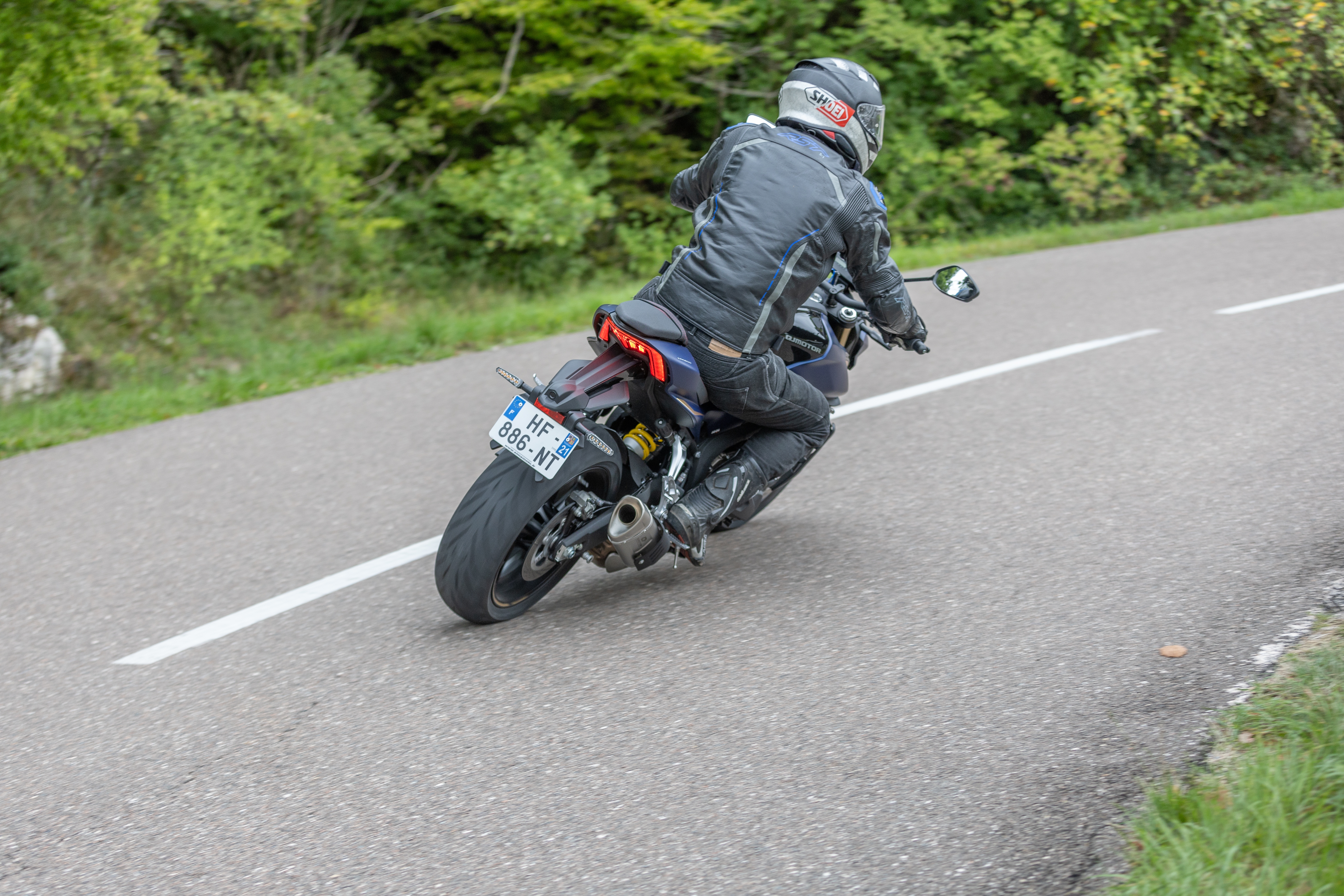 L’ABS, non déconnectable, se comporte bien, du fait d’une suspension au réglage intermédiaire entre confort et fermeté, tandis que les Angel GT officient correctement et faisant part de leur accroche impeccable sur les routes « hasardeuses » mais relativement propres et pas toujours sèches. Pas sûr que leur profil soit optimal au regard des caractéristiques sportives de la moto, mais leur résistance à la mise sur l’angle est moindre. L’avant demande cependant à être bien mené et bien chaud pour livrer sa pleine prestation. Quant à l’arrière, il est sous la protection du contrôle de traction. Le dispositif ne propose aucun réglage de sensibilité et se contente d’une détection simple de perte d’adhérence. Pas de centrale inertielle, donc, ce qui pourrait pourtant être le cas à ce niveau tarifaire. Est-ce nécessaire ? Non. Indispensable ? Non plus : la puissance demeure maîtrisable à la poignée des gaz.