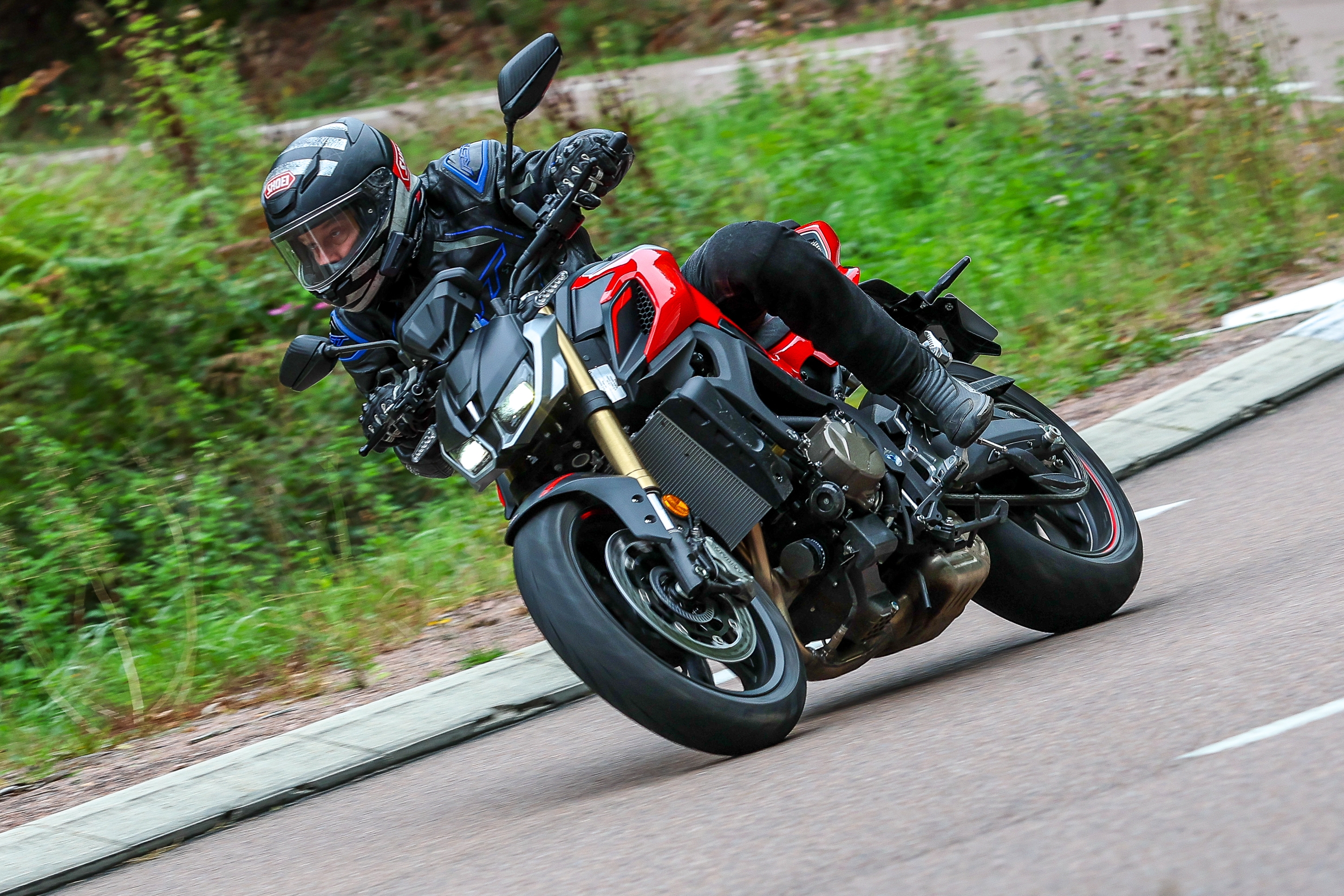 Justement, il faut dire qu’il sait en prendre, des tours, en atteignant près de 11 500 rotations par minute, quand bien même la puissance retombe après les 10 000. Quoi qu’il advienne, le compteur clignote déjà façon shift light pour avertir de la nécessité de passer le rapport supérieur… Les sensations moteur sont très présentes et l’énergie franche, enthousiasmante et communicative, notamment au travers d’un échappement expressif. Les relances de qualité offrent une belle plage d’utilisation, tandis que la souplesse du 4 en ligne est toute à son honneur, reste juste à composer avec de petites protestations si l’on tente de stabiliser le moteur aux alentours de 2 500 tr/min. On sent ce moteur à mi-chemin entre le coffre une CB 1000 R et celui d’une CB 650 R en matière de sensations mécaniques. Les 95 ch sont expressifs et bien répartis sur la plage d’utilisation, offrant d’exploiter au mieux la partie cycle.
