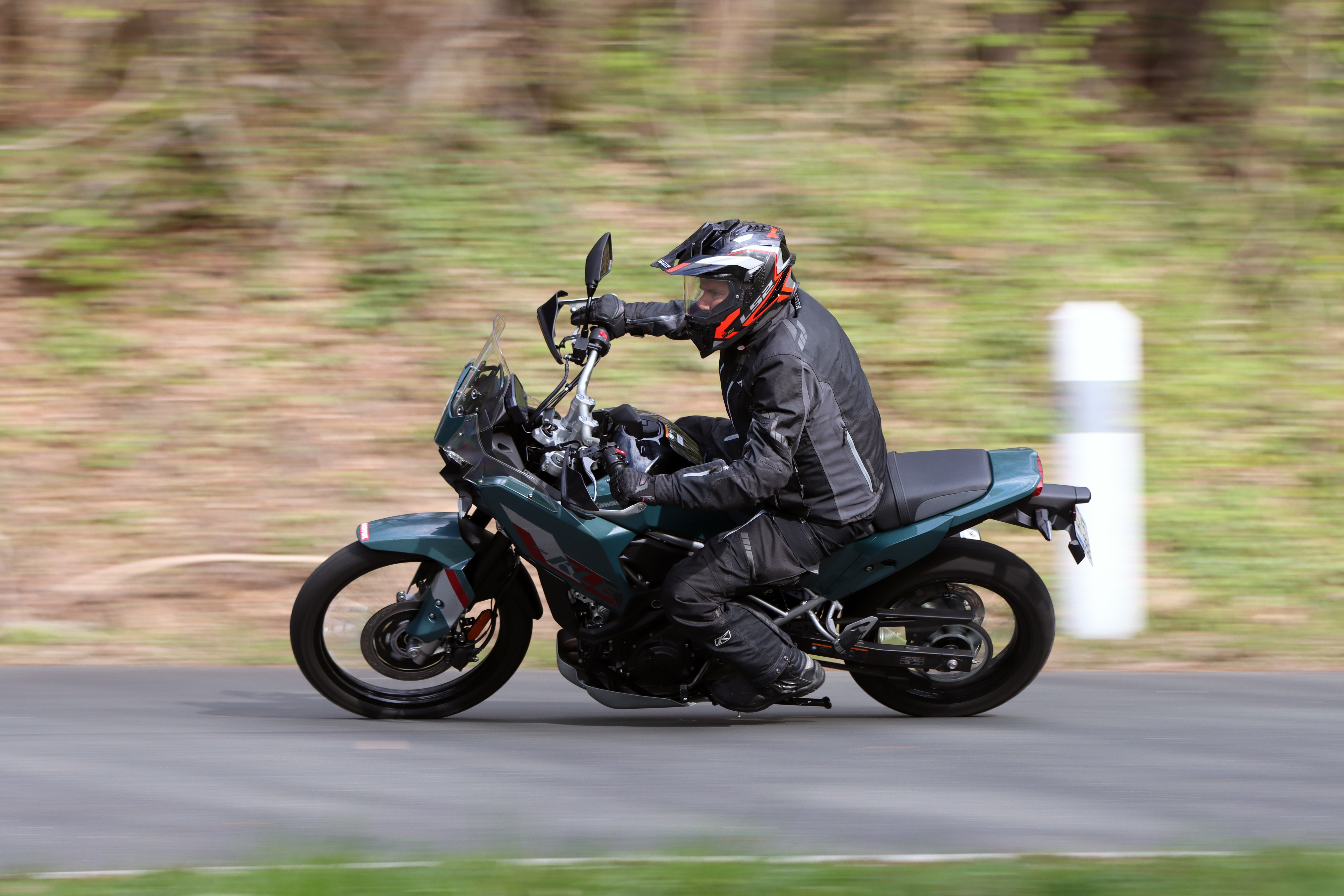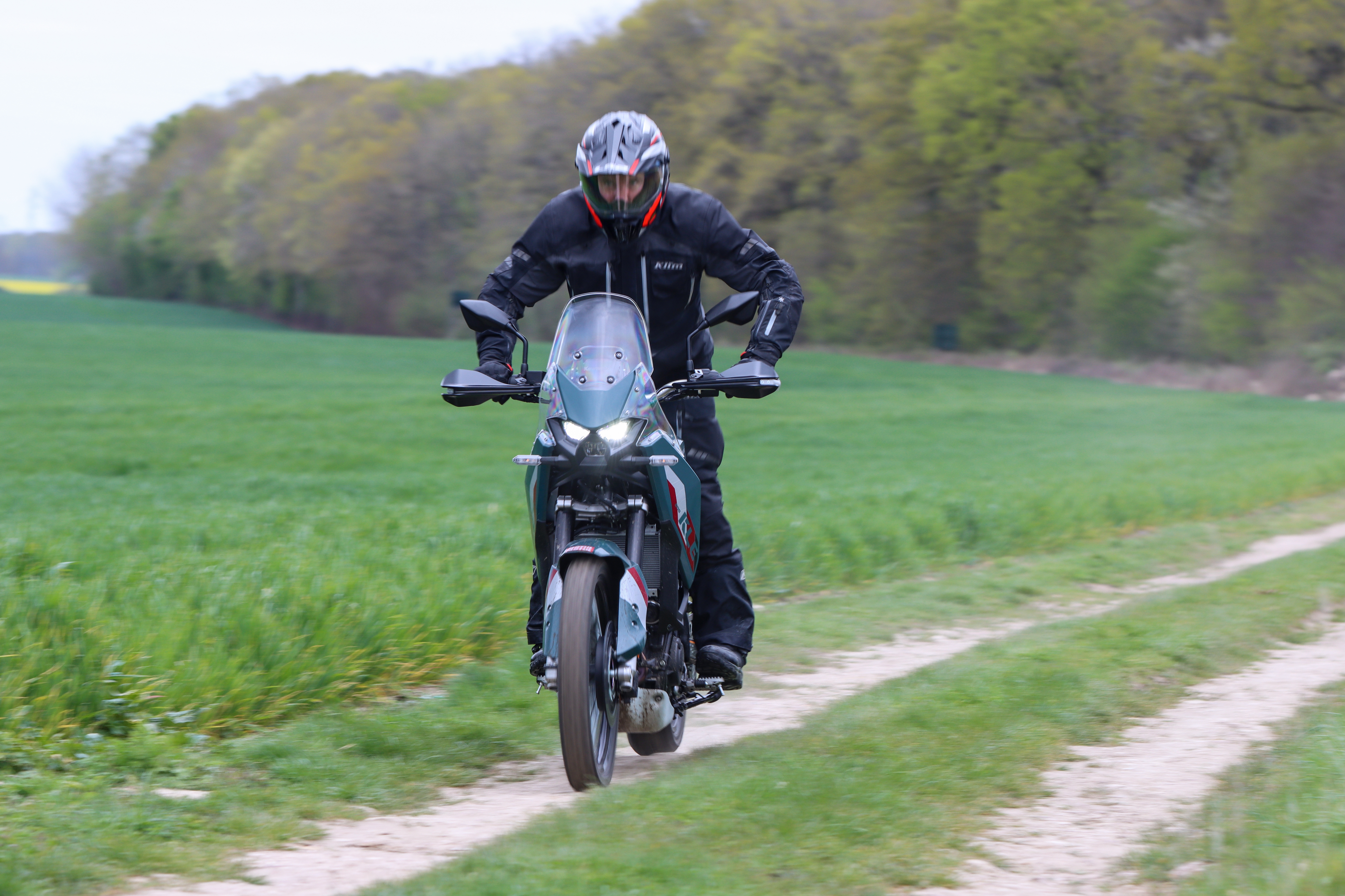De toute matière, la KLE n’est pas une grande voyageuse autoroutière : sa selle étroite se révèle plutôt ferme et la finesse générale de la partie avant expose vos jambes au flux d’air, qui s’infiltre, obligeant à lutter pour garder les cuisses plaquées au réservoir. Rouler au-dessus de 130 km/h n’est donc pas forcément très agréable sur de longues durées… La BMW R 1300 GSA peut dormir tranquille. De plus, le petit pare-brise rally, une fois positionné au plus haut, protège très correctement la tête mais pas les épaules et les bras, et surtout, comme souvent avec ce type de design, des turbulences sensibles sont générées au niveau du casque. Sur le réseau secondaire, les suspensions se montrent souples sur les compressions lentes, sans s’effondrer au freinage, elles encaissent plutôt bien les bouleversements type ralentisseur en vous préservant les lombaires mais elles peinent à absorber les fripures et autres compressions rapides : leur relative sécheresse face à ce type de défaut conjuguée à la fermeté de la mousse de selle ne profite pas au confort.