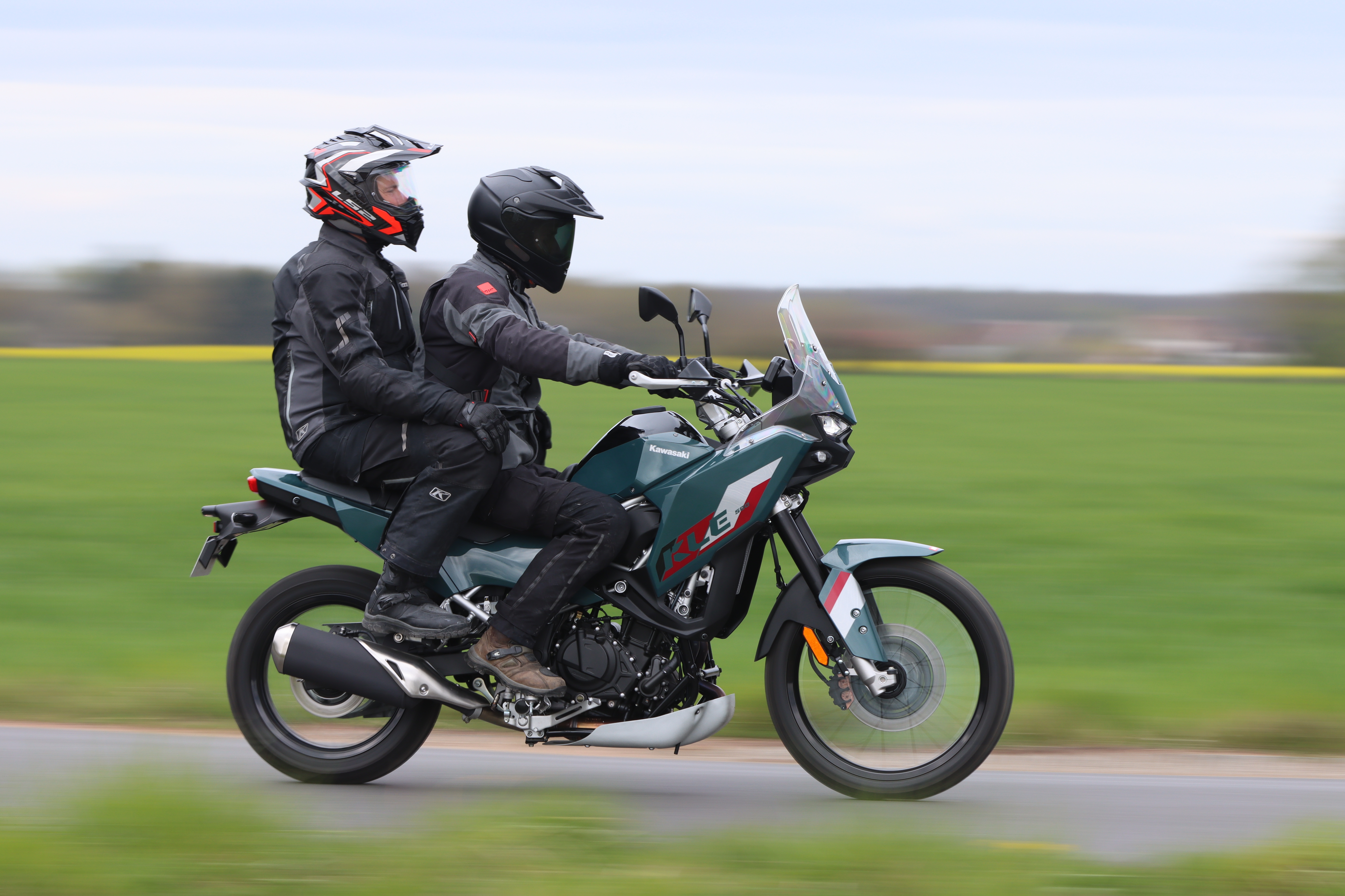 Si l’on pouvait craindre le duo vu la fermeté de la selle et l’absence de poignées de maintien, la KLE 500 se comporte étonnamment bien grâce à un positionnement des repose-pieds passagers parfait pour résister à l’accélération. L’occupant du strapontin arrière est cependant assis un peu trop bas pour voir autre chose que les épaules ou le casque du pilote mais c’est souvent le cas sur les trails.