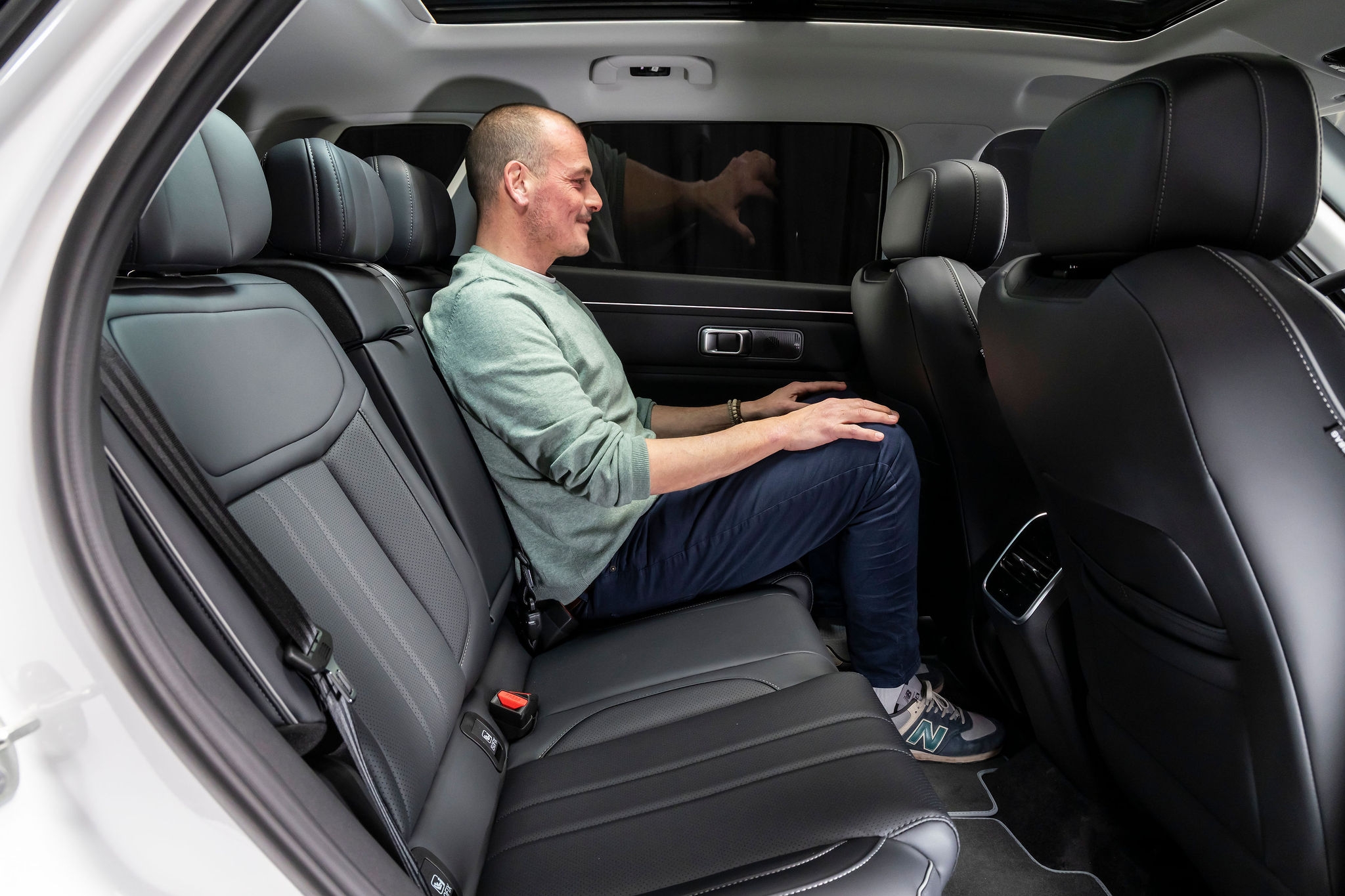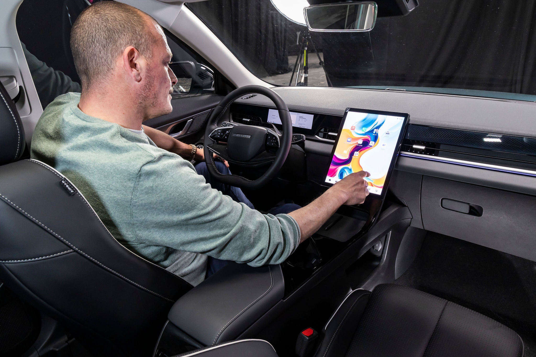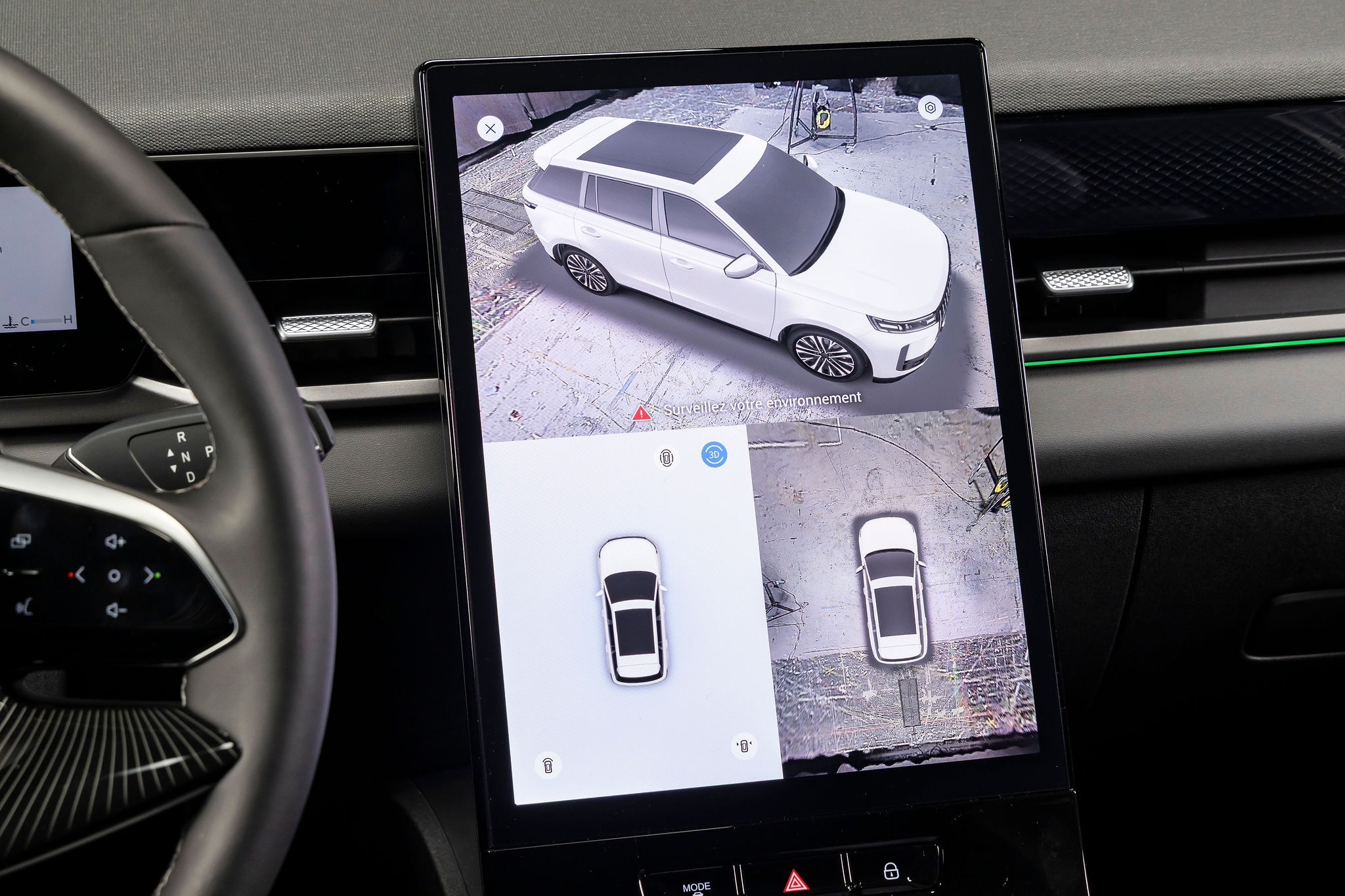 À l’intérieur, on découvre un habitacle qui tente l’élégance. C’est plus ou mois réussi. La sellerie composée d’un cuir synthétique n’est pas d’une qualité exceptionnelle et quelques plastiques laqués ternissent un effort incontestable sur la présentation. On aime les plastiques moussés, les inserts en aluminium brossé et les surpiqûres. Le conducteur fait face à un minuscule combiné d’instruments numérique secondé par un écran central tactile de 13,2 pouces, placé à la verticale. Ce dernier a l’air d’être assez réactif à l’usage et dispose des connectivités Android Auto et Apple sans fil.