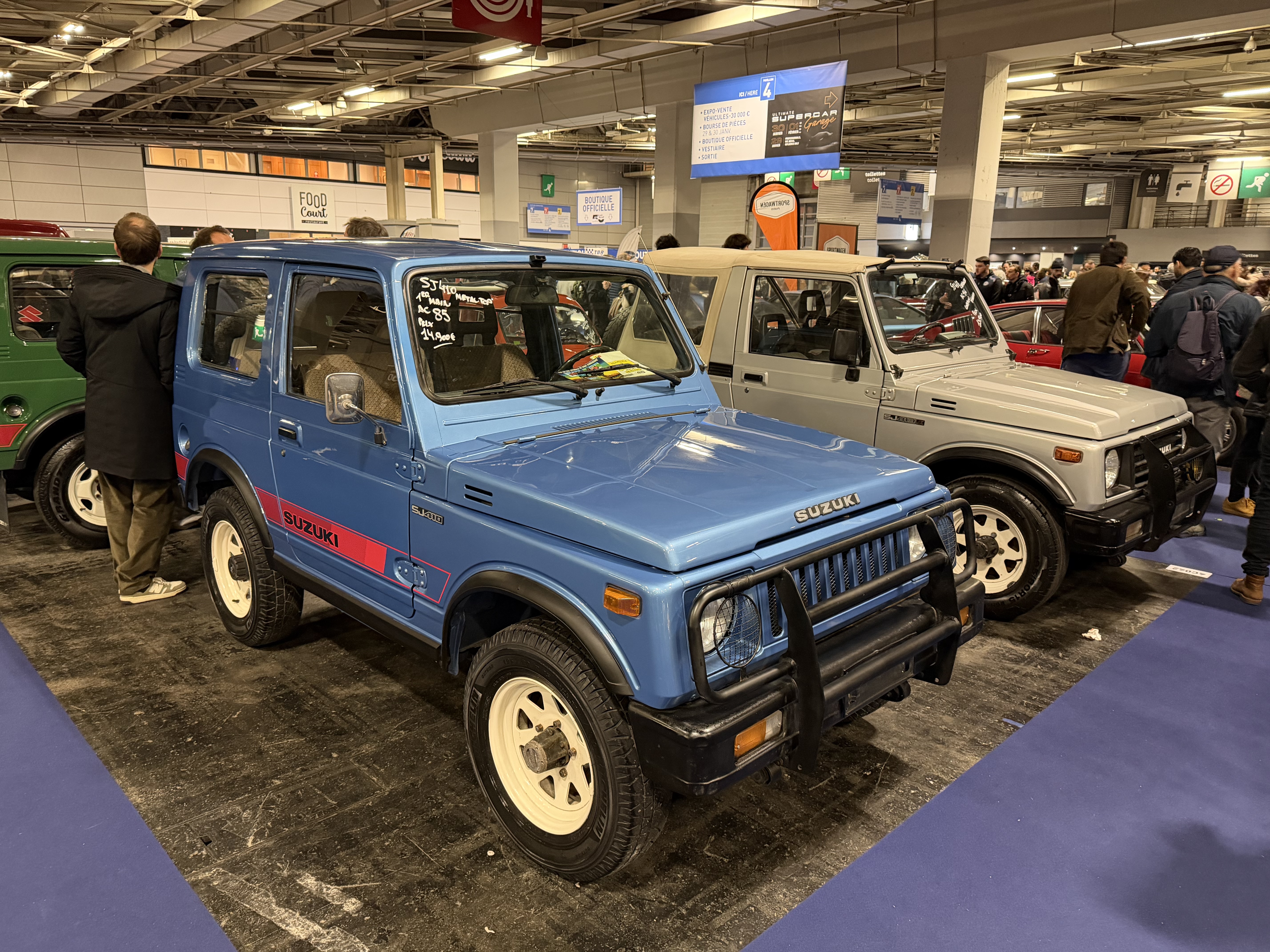 J’ai naturellement tenu à traîner l’immense Stéphane Schlesinger devant un joli quatuor de Suzuki Jimny présents dans le hall 4 du salon Rétromobile 2026. Même avant de posséder un exemplaire de la génération actuelle, j’adorais l’esthétique très « années 80 » de la seconde mouture. Les exemplaires exposés ici par le vendeur illustrent parfaitement cette image du petit 4x4 haut en couleurs et fun des « eighties ».