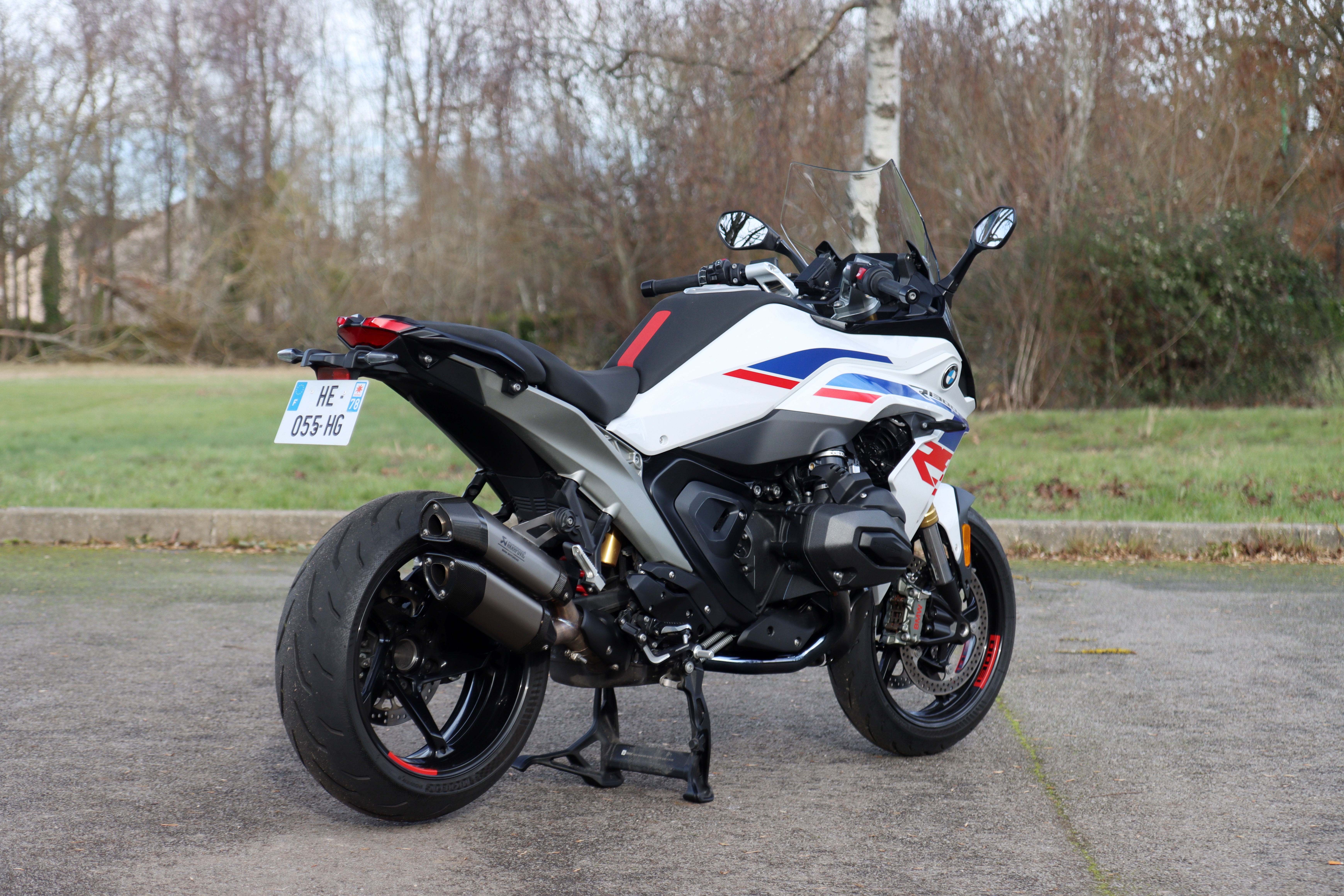 De plus, le silencieux Design, noir et aux flûtes superposées, associé à la ligne d’échappement Dark Chrome à la finition brillante et du meilleur effet pour ce qui est d’obtenir un look « tout noir » au niveau du moteur, le dit « contenu Performance », la selle conducteur haute et la selle passager Sport, coordonnées et parées d’une bande rouge rehaussant la ligne, le sabot moteur inférieur discret et prenant place sous les écopes latérales, la suspension Sport remontant encore la moto tout en lui offrant – aux dires du constructeur — un comportement plus sportif et enfin des jantes noires elles aussi parées de pneumatiques sportives (ici des Michelin Power 6 en 190/55 à l’arrière),