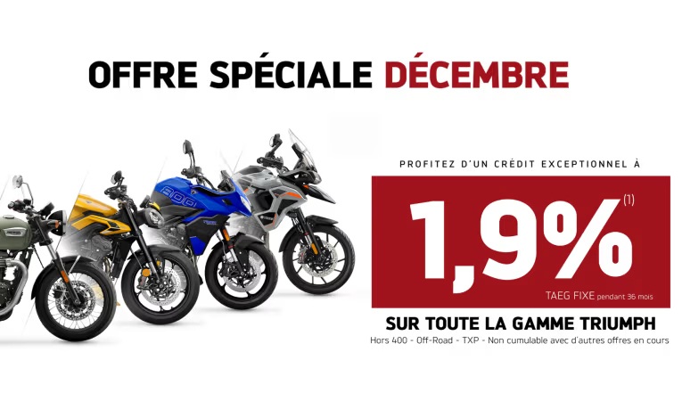 Jusqu’au 31 décembre prochain, le constructeur anglais Triumph fait profiter à ses clients d’une offre de financement, avec un crédit au taux de 1,9 %. De quoi s’offrir sereinement l’un des nombreux modèles de plus de 500 cm3 du catalogue.